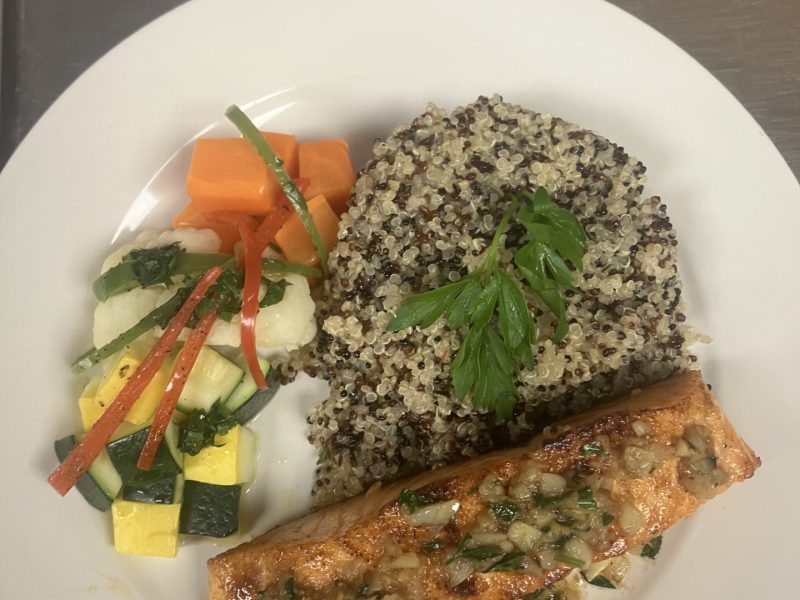 “We also offer a lot of plant-based meals, including vegan chicken and veggie burgers,” he explains. “Portion control is important, and we aim for a healthy balance between meat, seafood, and plant-based options.” Seafood is featured at least twice a week, and certain favorites—like tuna salad and cured salmon—are always available. “I’d be in big trouble if I took those off the menu!” he adds with a laugh.